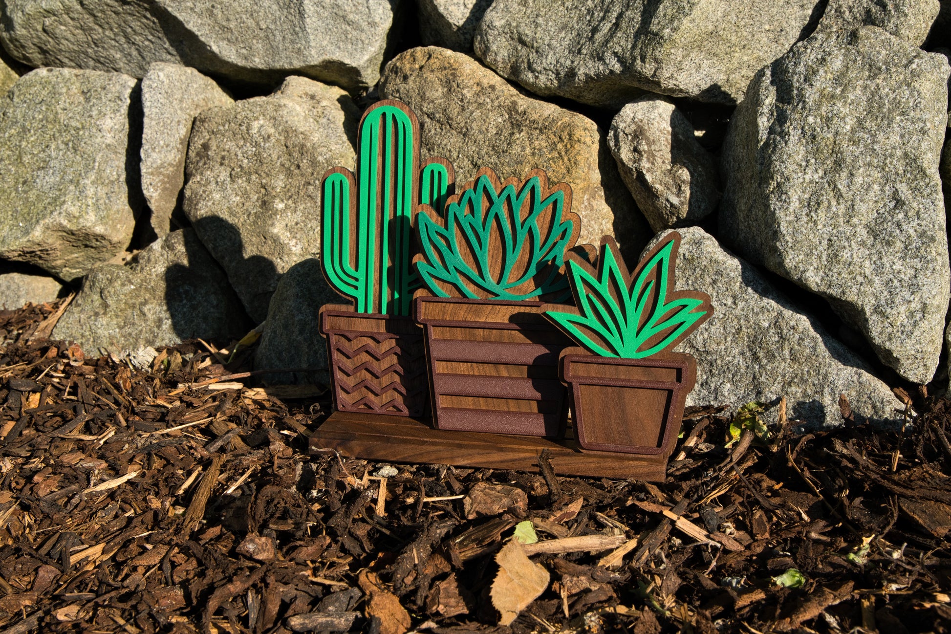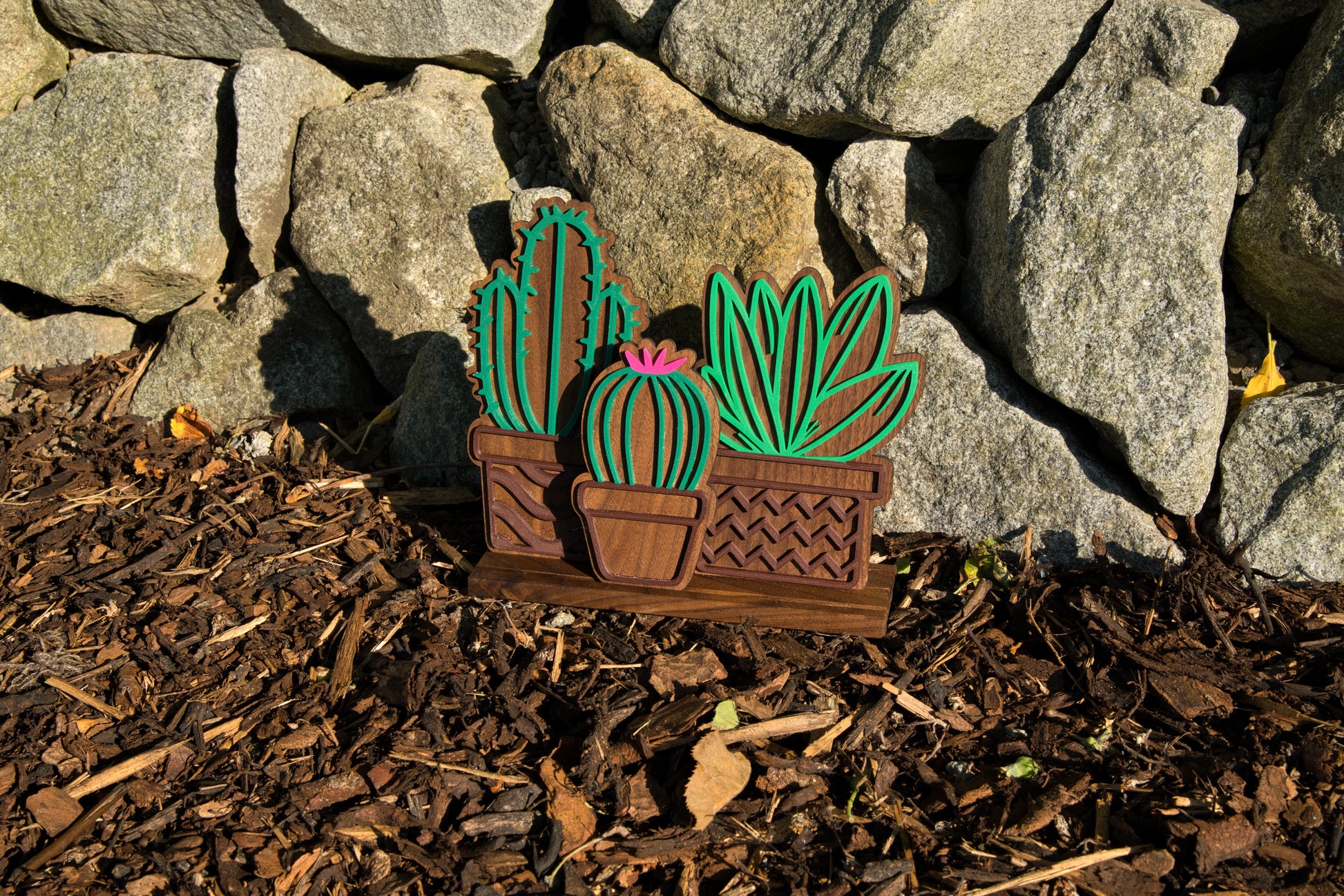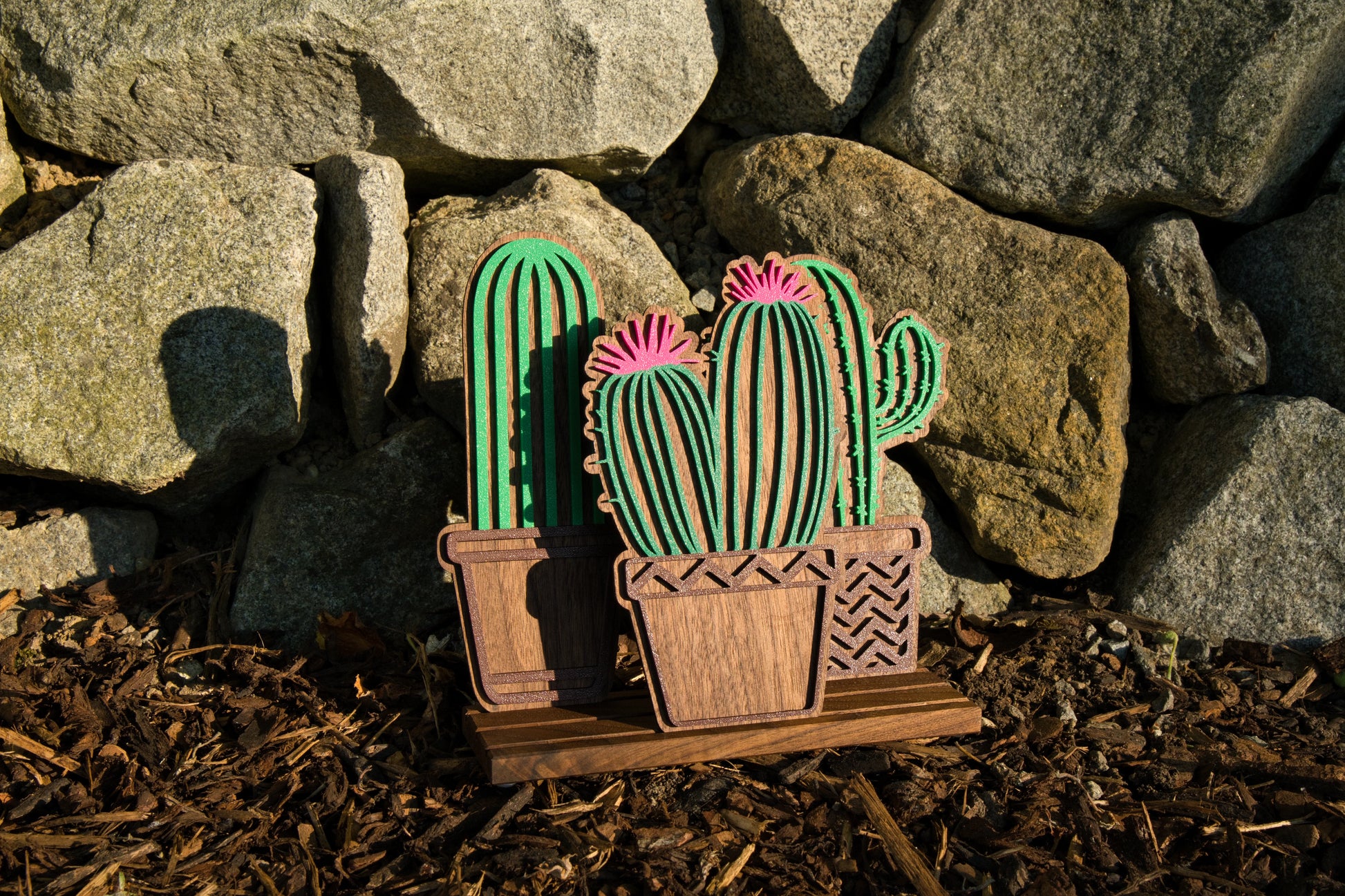 Jeder Topf und die Basis werden präzise aus edlem Walnussholz gelasert, während die Kakteen selbst mit einem 3D-Drucker gefertigt und auf die Holzelemente gesetzt werden. Das Ergebnis: Eine spannende Kombination aus traditionellem Material und moderner Fertigung.